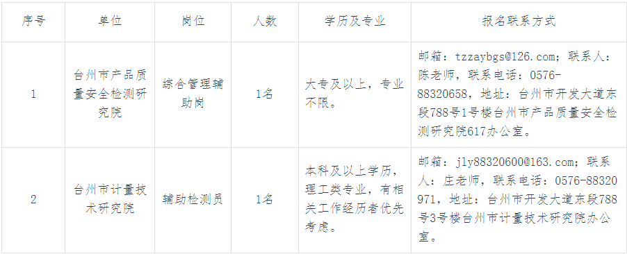 原文标题:台州市市场监督管理局下属事业单位招聘编外工作人员公告