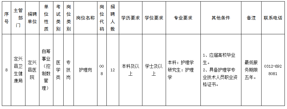 2025年定兴县医院公开招聘控制数管理人员的公告《岗位信息表》中,定兴县医院医学类护理岗008岗位条件以本补充公告为准。