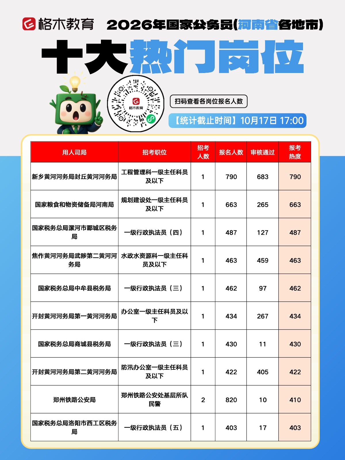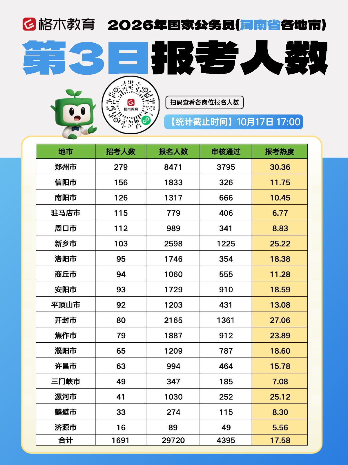 2026年国考首日报名人数统计:截至10月16日17时,河南招录1691人,报名人数29720人,审核通过13134人。