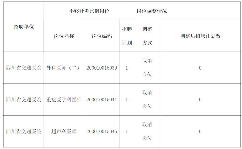 根据《四川省交通运输厅关于所属事业单位2025年下半年公开考试招聘工作人员的公告》有关规定和考生报名缴费情况,因有效报考人数与招聘岗位人数之比未达到笔试开考比例,现对3个岗位共计3个名额作取消处理。具体情况如下: