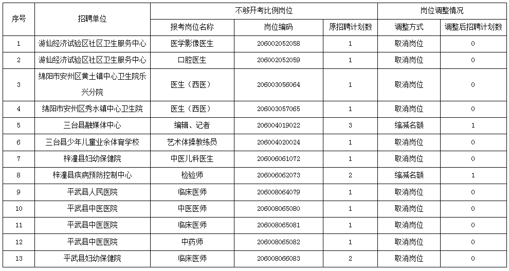 按照《四川省绵阳市事业单位2025年下半年公开考试招聘工作人员公告》相关规定和考生报名缴费情况,以下岗位因考生缴费人数与招聘人数之比未达到公告规定的笔试开考比例,现将调减和取消部分岗位情况公告如下: