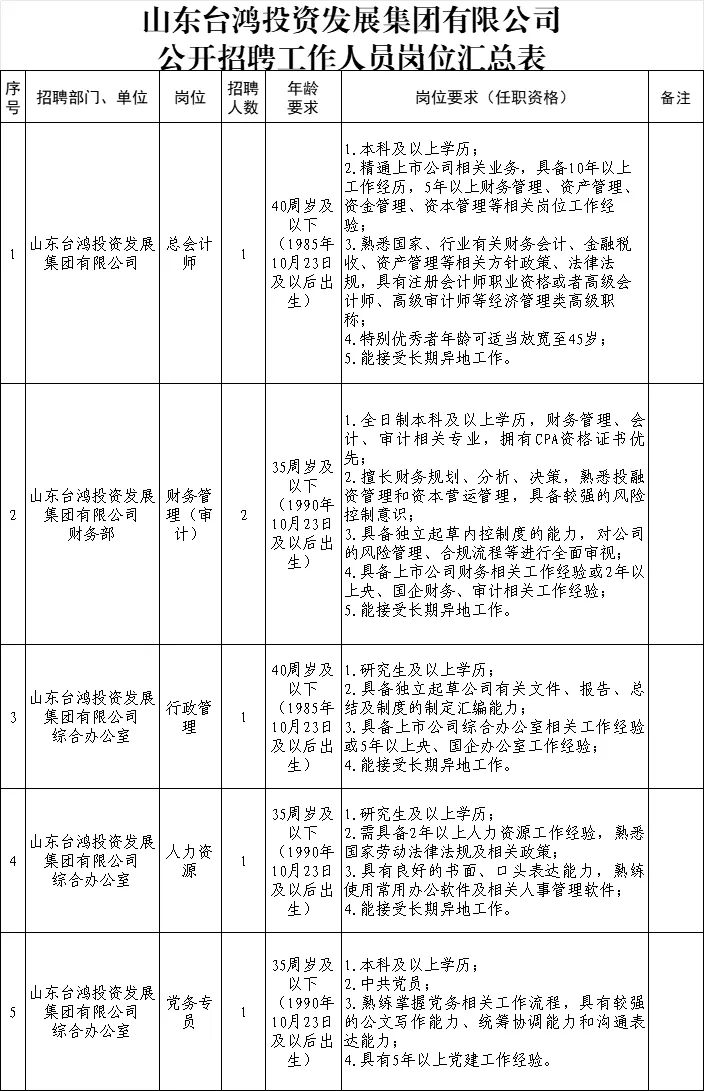 招聘岗位及要求详见《山东台鸿投资发展集团有限公司公开招聘工作人员岗位汇总表》(附件1)。