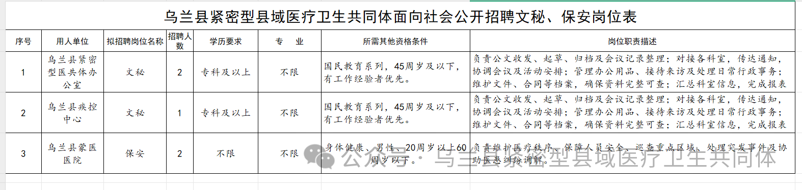 原文标题:乌兰县紧密型县域医疗卫生共同体关于面向社会公开招聘文秘、保安的公告