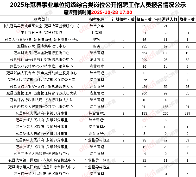 原文标题:2025年冠县事业单位初级综合类岗位公开招聘工作人员(截止28日17:00报名数据)