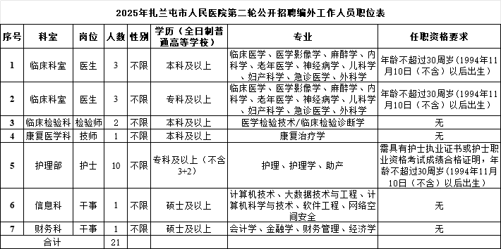 此次计划公开招聘7个职位,21名编外工作人员。详情请阅读《2025年扎兰屯市人民医院第二轮公开招聘编外工作人员职位表》(以下简称《职位表》,见附件)。