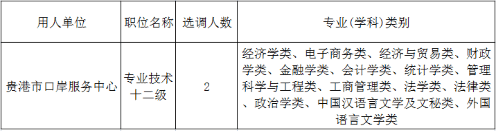 为适应新形势新任务要求,加强商务系统干部队伍建设,贵港市商务局下属正科级全额拨款公益一类事业单位贵港市口岸服务中心面向全市公开选调2名事业单位工作人员。现将有关事项公告如下: