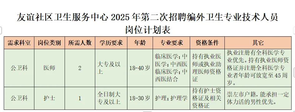 原文标题:【招聘】崇左市江州区友谊社区卫生服务中心2025年第二次公开招聘编外聘用卫生专业技术人员公告