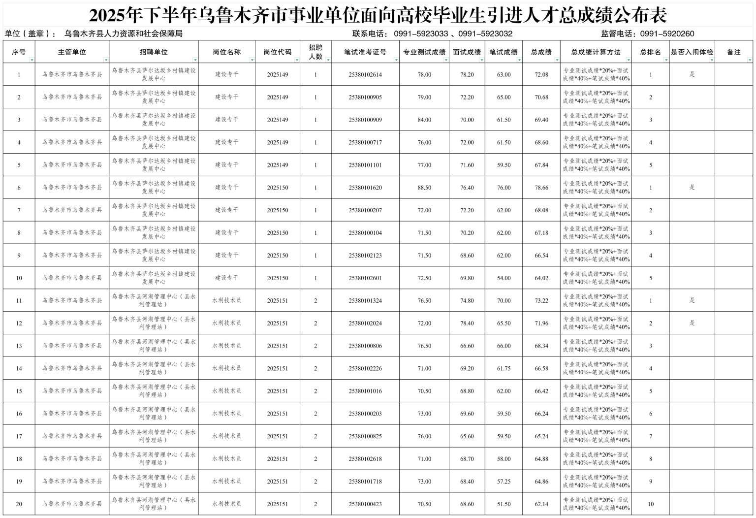原文标题:2025年下半年乌鲁木齐市事业单位面向高校毕业生引进人才总成绩公布表