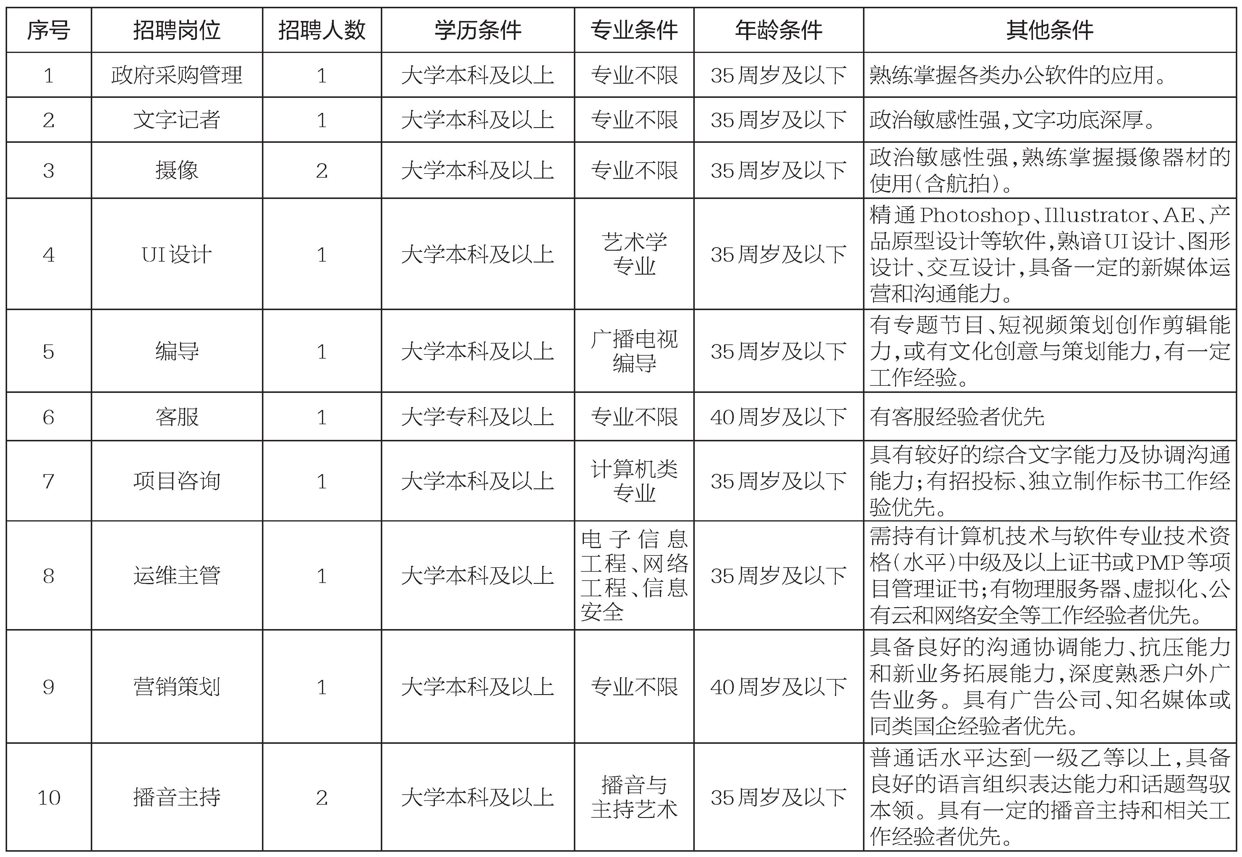 因工作需要,宁海传媒集团(宁海县广播电视台)下属公司拟面向社会公开招聘工作人员12名,具体事项公告如下: