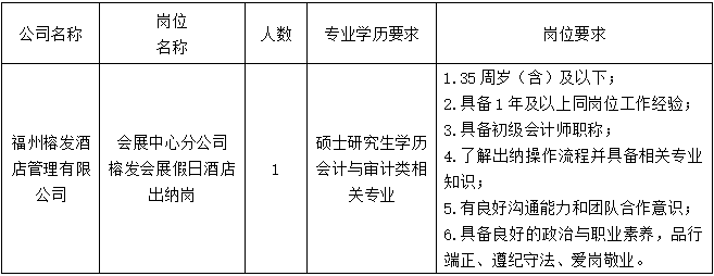 本批次拟向社会公开招聘权属企业榕发酒管公司1个岗位,共计1人。