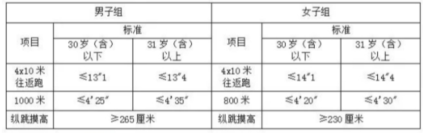 (2)体能测试参照《公安机关录用人民警察体能测评项目和标准(暂行)》开展,测试项目为纵跳、4×10米往返跑、1000米(男)或800米(女)长跑三项(合格标准如图)。体能测试所有项目成绩均合格者入围面试环节;若有某个单项未达到合格标准的,则不能进入面试环节;若某岗位所有体能测试人员均有某个单项未达到合格标准的,则该岗位取消;
