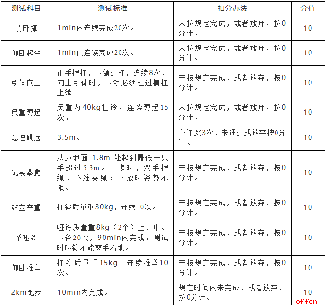 每个科目实行量化评分,并对个人综合得分进行量化排名,体能科目得分低于20分的或者总分低于80分,直接淘汰。