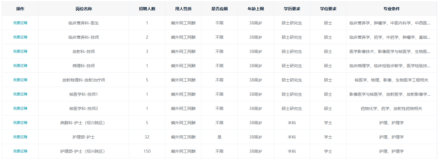 仅接受医院官网招聘系统报名,报名路径:医院官网>在线招聘>招聘公告>《浙江省肿瘤医院2026年临床医技科室编外同工同酬岗招聘公告》>选择岗位>我要报名。报名截止时间:2025年12月21日(周日)24:00.