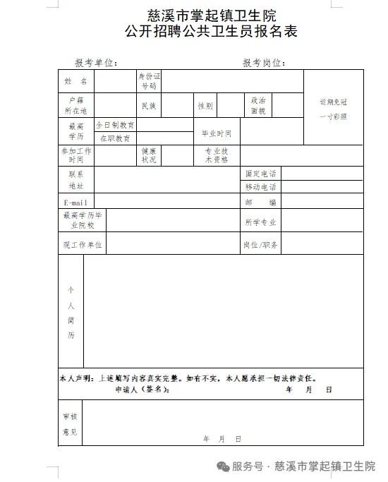 2、报名地点:慈溪市掌起镇卫生院(慈溪市掌起镇慈掌路460号)三楼党政综合办303.