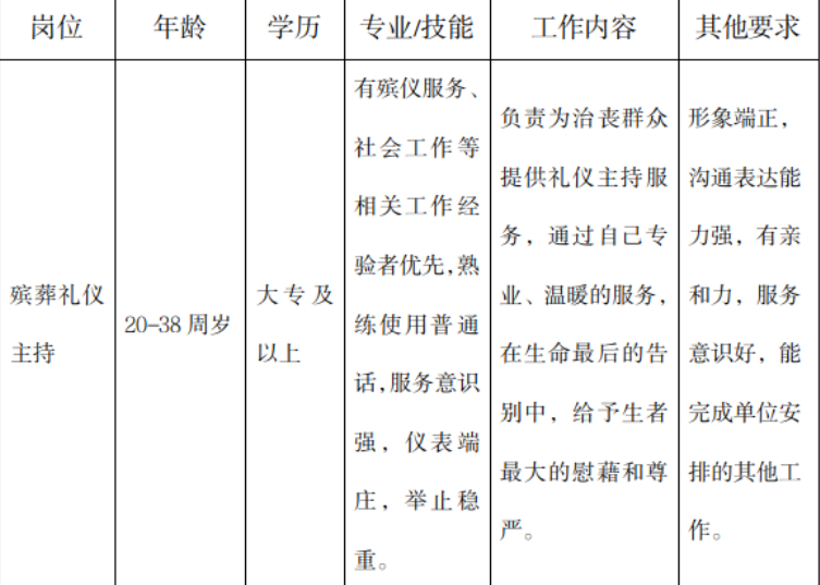 (二)招聘岗位及数量:殡葬礼仪主持1名。