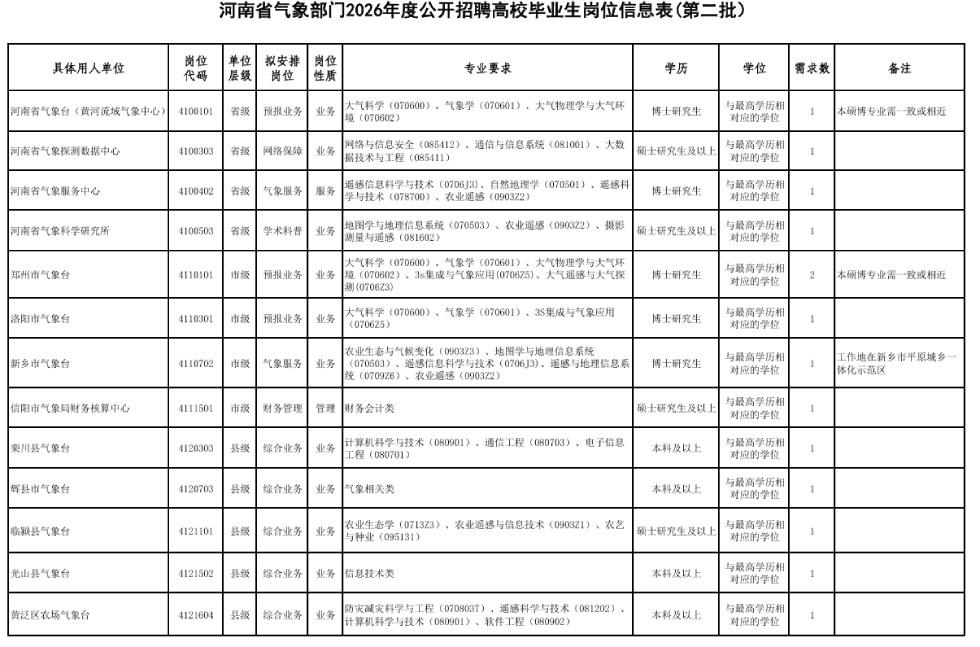 河南省气象部门2026年度国家气象系统编制计划公开招聘气象类、气象相关类、信息技术类、财务会计类应届高校毕业生(第二批)14名。具体岗位见附件1。