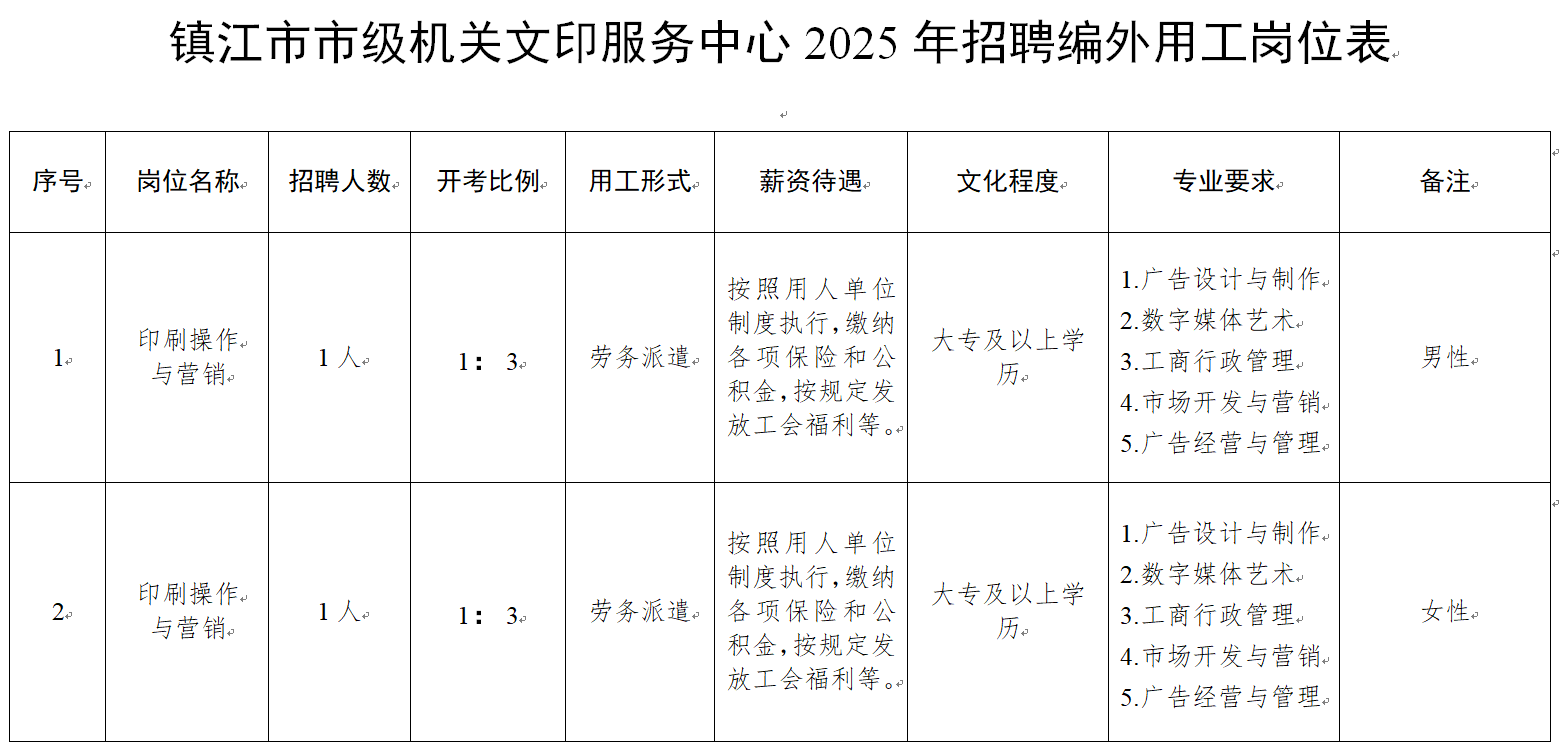 根据《镇江市市级机关事业单位编外用工管理办法》文件精神,依据《镇江市机关事务管理局编外用工管理办法》,结合本单位编外用工空缺和工作需要,市级机关文印服务中心决定招聘编外用工(印刷操作与营销)2名。