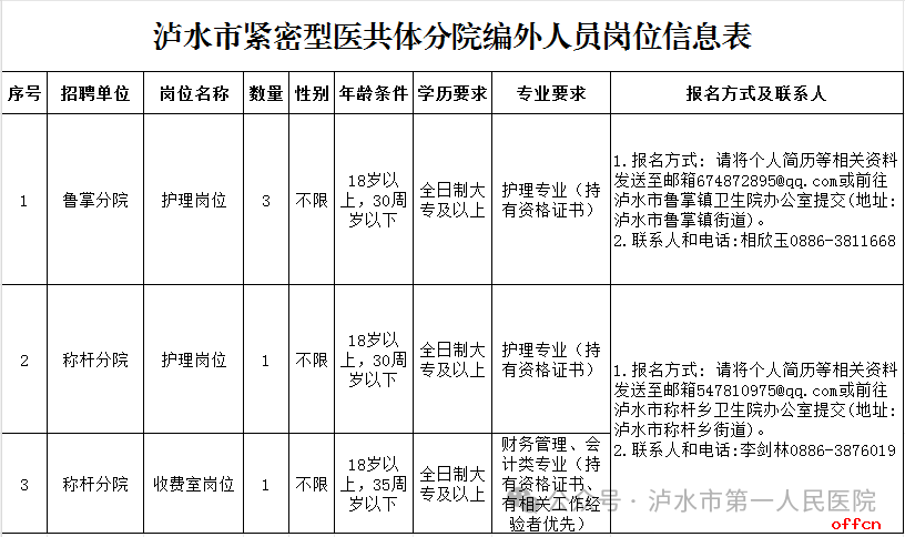 分院现场/线上报名:详见《泸水市紧密型医共体2026年编外人员招聘岗位信息表》。