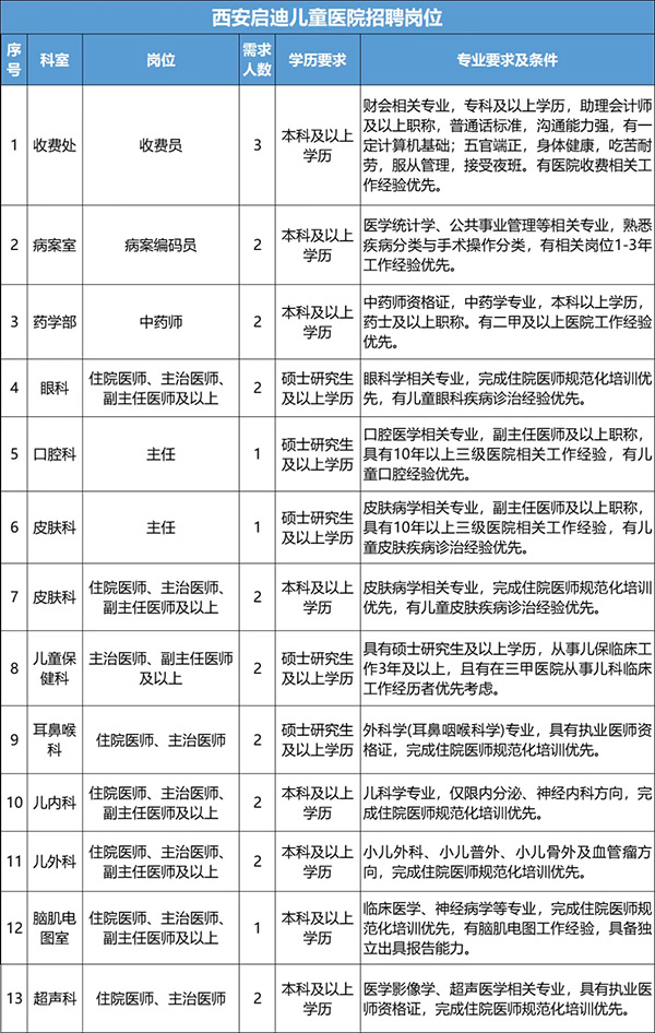 原文标题:西安医学院儿童医院(西安启迪儿童医院)医疗及行政人员招聘公告
