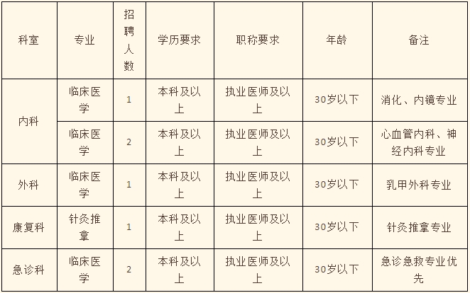 说明:1、执业医生招聘年龄30岁及以下(1996年1月之后出生)。