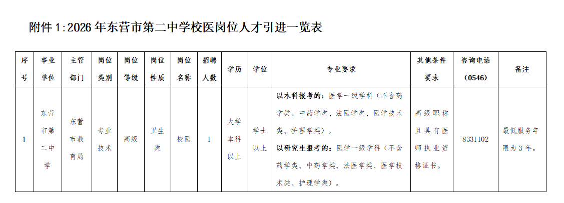 2026年东营市第二中学校医岗位人才引进岗位具体情况详见一览表(附件1)。