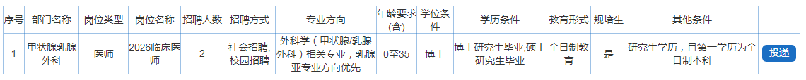 为满足医院临床业务需求,经我院研究决定,甲状腺乳腺外科拟招聘临床医师2名,具体如下: