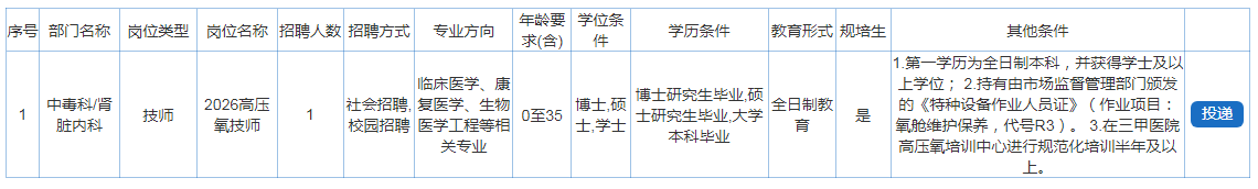 原文标题:四川大学华西公共卫生学院/华西第四医院 中毒科/肾脏内科高压氧技师招聘启事