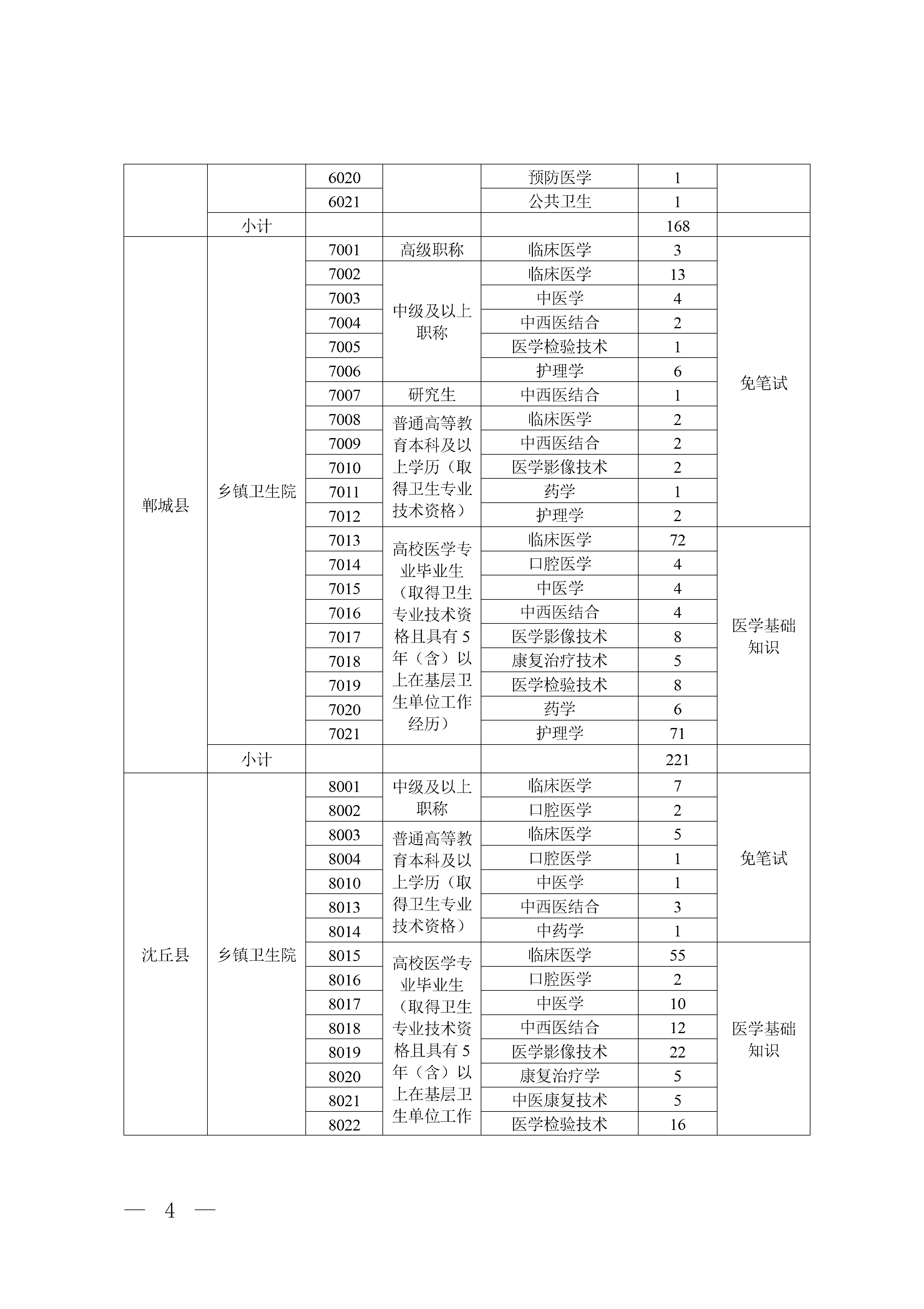 全市计划拟招聘984名专业技术人员到乡镇卫生院(不含社区卫生服务中心,下同)工作。招聘专业涵盖临床医学、口腔医学、中医学、中西医结合、护理、药学、医学技术、公共卫生等。各县(市、区)具体招聘岗位及要求详见附件1。