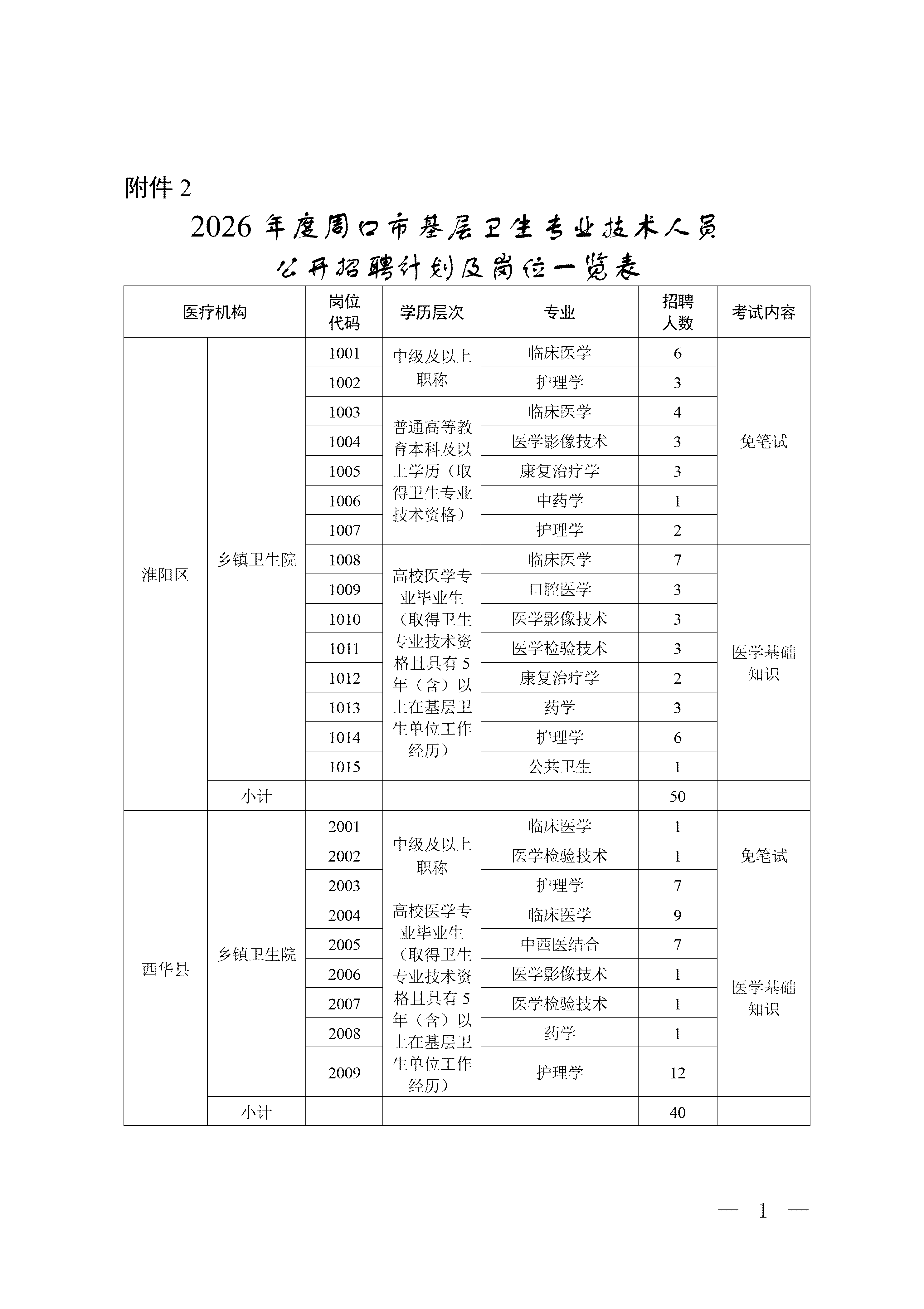 附件:1、2026年度周口市基层卫生专业技术人员公开招聘计划及岗位一览表.doc