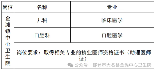 公务员考试网为各位考生带来:2026河北邯郸市大名县金滩中心卫生院公开招聘公告。 考生还可以关注本栏目了解更多河北医院招聘考试精彩内容。