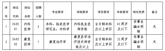 因工作需要,我院拟向社会公开招聘内科医师2人,康复技师1人,均属于非事业编合同制。