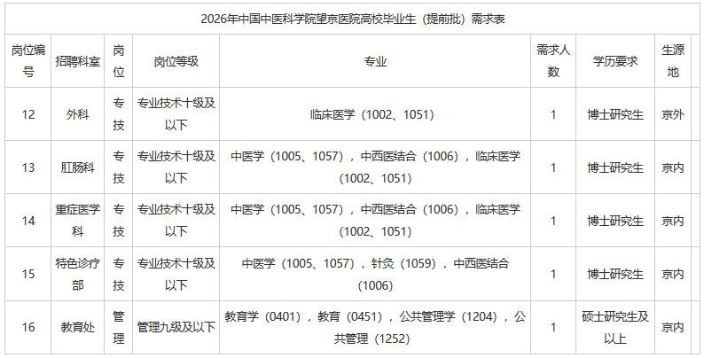 原文标题:中国中医科学院望京医院2026年公开招聘国内应届高校毕业生(提前批)公告