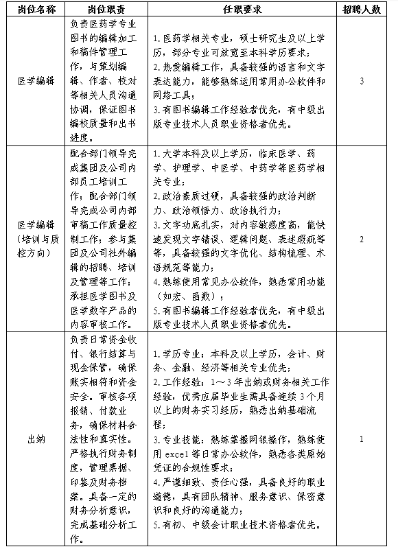 1.具有岗位所需的专业知识或技能,愿意用专业所长服务医学出版工作;
