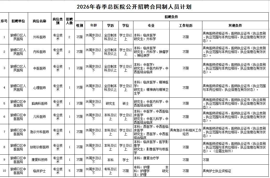 原文标题:旅顺口区总医院2026年春季合同制工作人员招聘公告