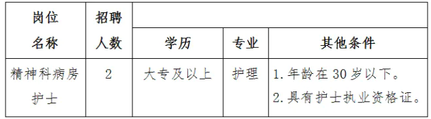 具体招聘岗位为精神科男病房护士1人(限男性);精神科女病房护士1人(限女性)工作地点为精神科病房。